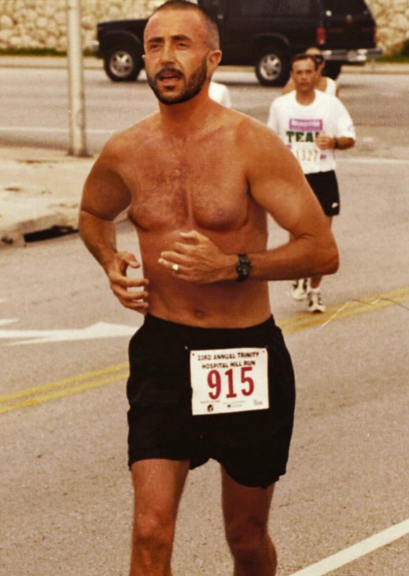 The top running photo is me in October 2000, not quite half way into the Marine Corps Marathon in Washington, D.C. I finished the race, my eighth (and last!) full marathon, and my fifth on the course in Washington. The shirtless run was on a far too hot day near the finish of the Trinity Hospital Hill half marathon, Kansas City, Mo., in the 1990s. And finally, my marathon tattoos! -- permanently celebrating my eight 26.2-miler finishes and p.r. across the right shoulder blade. There's a separate Marine Corps Marathon tattoo on the left of the back, as five of my eight finishes have been on that classic race in Washington,D.C./Arlington, Va.